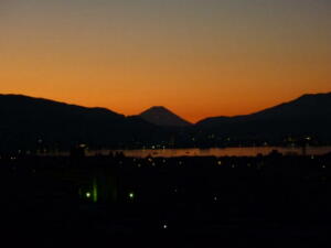 平成22庚寅御柱年1月17日午前6:20頃撮影毎年山の神様の例祭日で恵方に矢を射ます以前は早朝明るくなる前に行ないましたが最近は文字が読める程度になるのを待ちます今年も朝焼けの富士山(蔭富士と呼ばれる) |