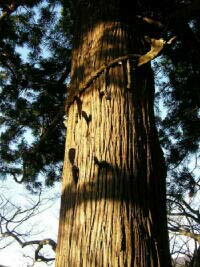 今年行なわれたナギガマ打ちの杉の木を見学に行ってきました 古い薙鎌は黒く錆びていますが新しいのは赤錆びです この木には昭和24年から12年ごとに打ち込まれたなぎがま が写っています |