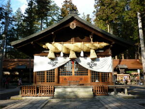 平成22庚寅御柱年1月4日午後2:30頃撮影春宮の神楽殿に注連縄が新調されました前回よりも一回り太くなったようです |