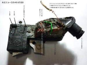 このチエンソーの高圧発生部には困っています電子部品部を解体して使える物として残った姿です
