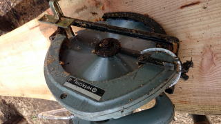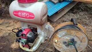 古い背負いエンジン噴霧器を流用最低回転で充分